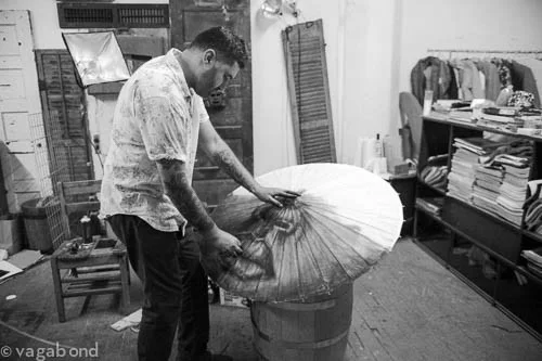 Charcoal, spray paint, paper umbrella, digital prints